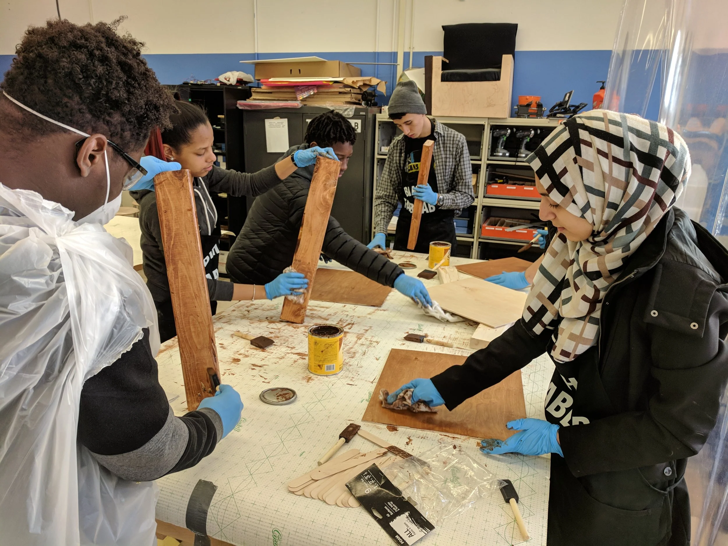 Students built wooden frames in the school’s fab lab, which involved cutting, sanding, staining, and assembling with screws.